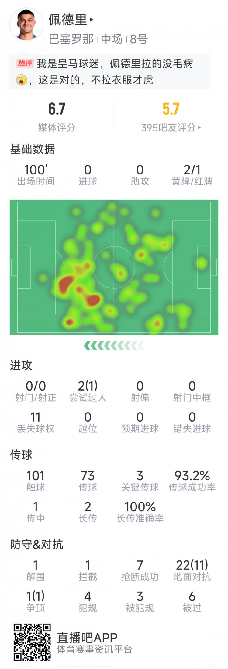 10月27日讯 在本轮西班牙国家德比,皇马2-1击败巴萨,苏超直播佩德里在最后时刻被驱逐 罚下,以下为他在本场数据: