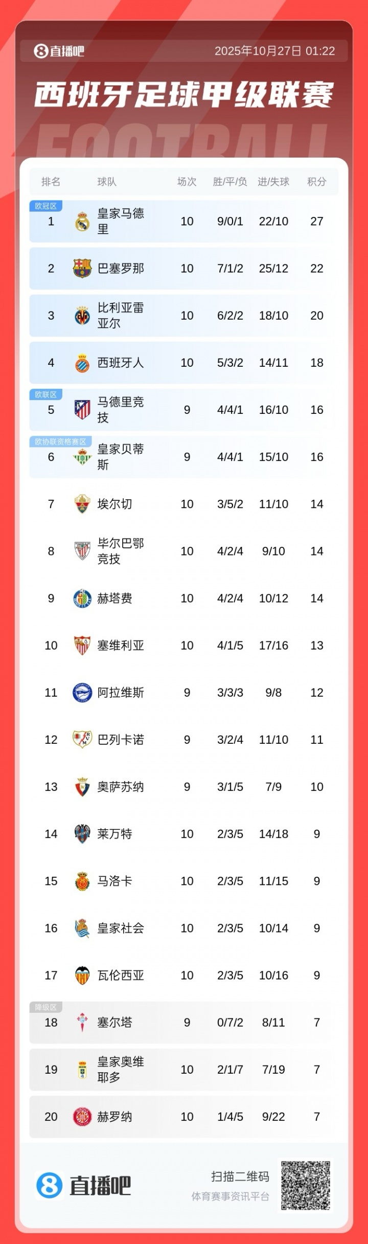 皇马27分领跑积分榜,苏超直播在线观看领跑 巴萨5分。