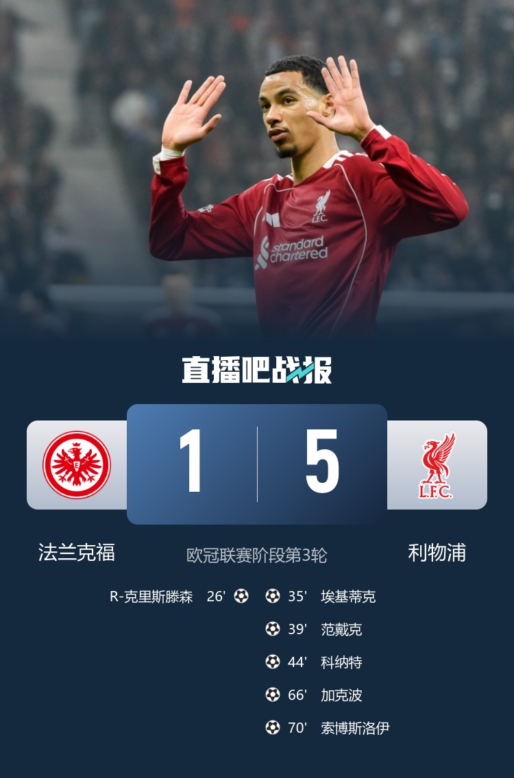 10月23日讯 在本轮欧冠,利物浦5-1大胜法兰克福。
